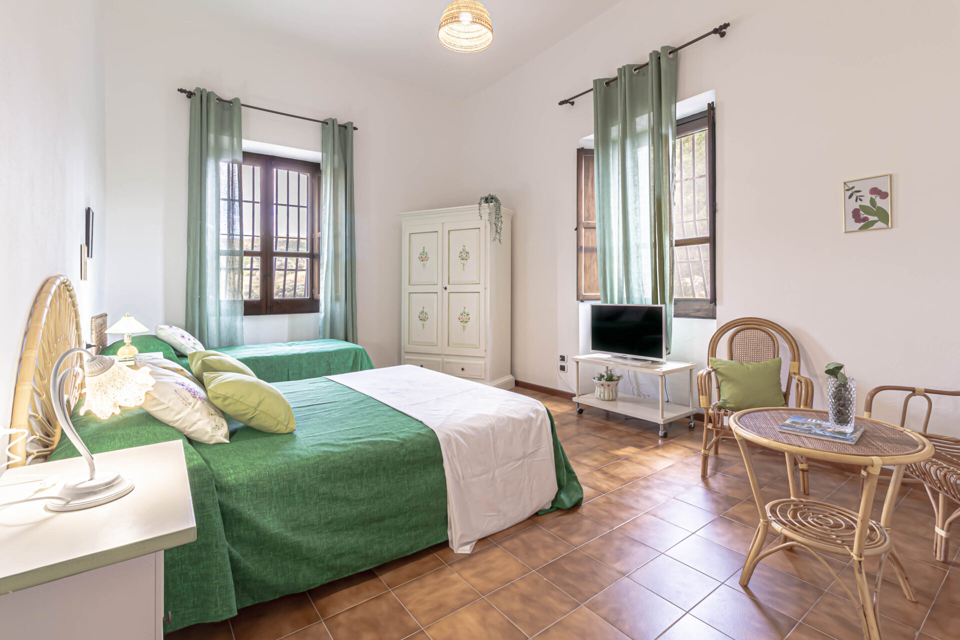 La Camera Gelsomino è l’ambiente perfetto per chi cerca il massimo comfort: un ampio letto matrimoniale e un comodo letto singolo, ideali per ospitare coppie o famiglie. La camera è dotata di una TV a schermo piatto, mentre l’angolo salottino crea uno spazio rilassante per leggere un libro o sorseggiare una bevanda.